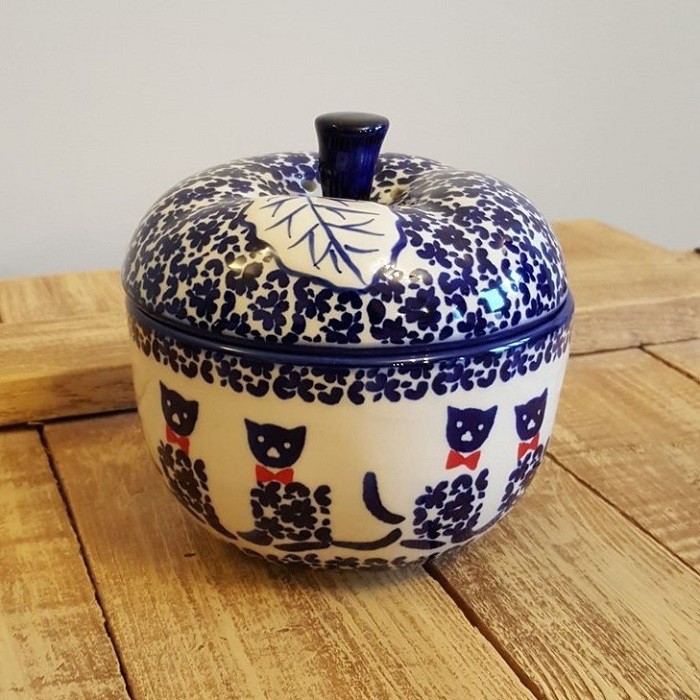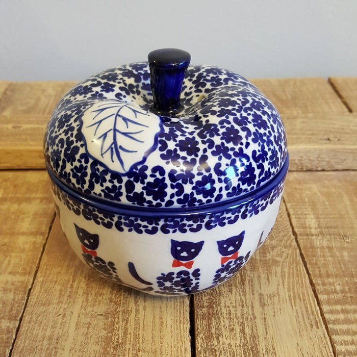 丈夫で熱に強く、電子レンジやオーブンもOKなのがポーランド陶器の魅力! 蓋に四箇所、蒸気を逃がす穴があいており、りんごを丸ごと蒸し焼きにすることができます。