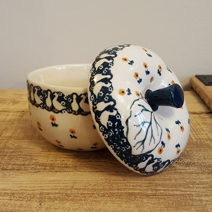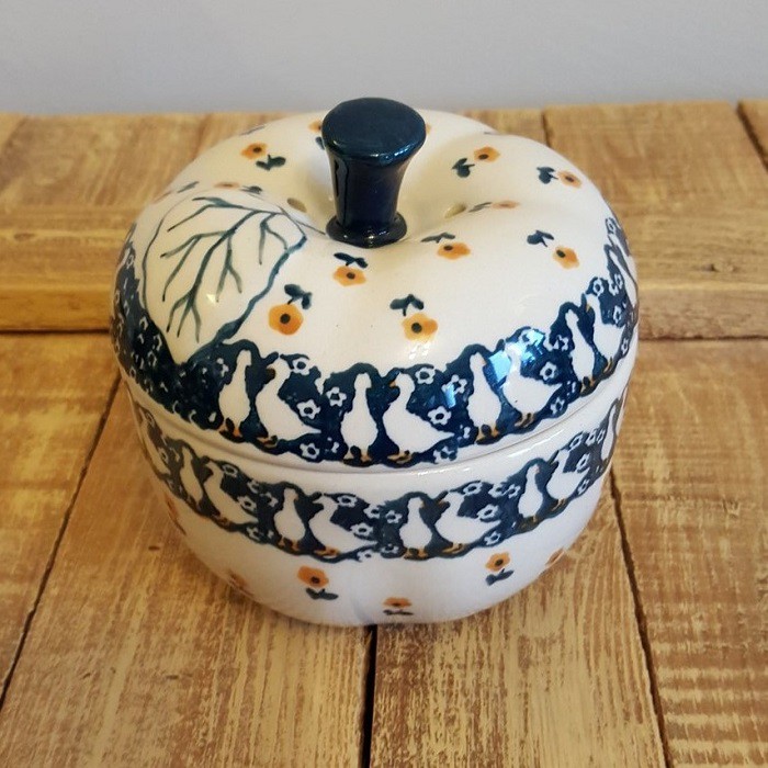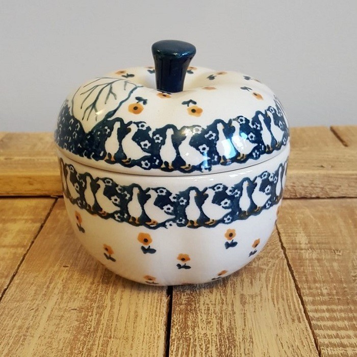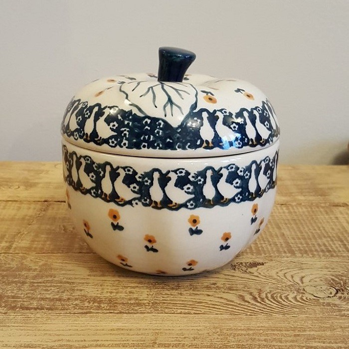 丈夫で熱に強く、電子レンジやオーブンもOKなのがポーランド陶器の魅力! 蓋に四箇所、蒸気を逃がす穴があいており、りんごを丸ごと蒸し焼きにすることができます。