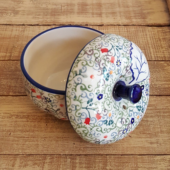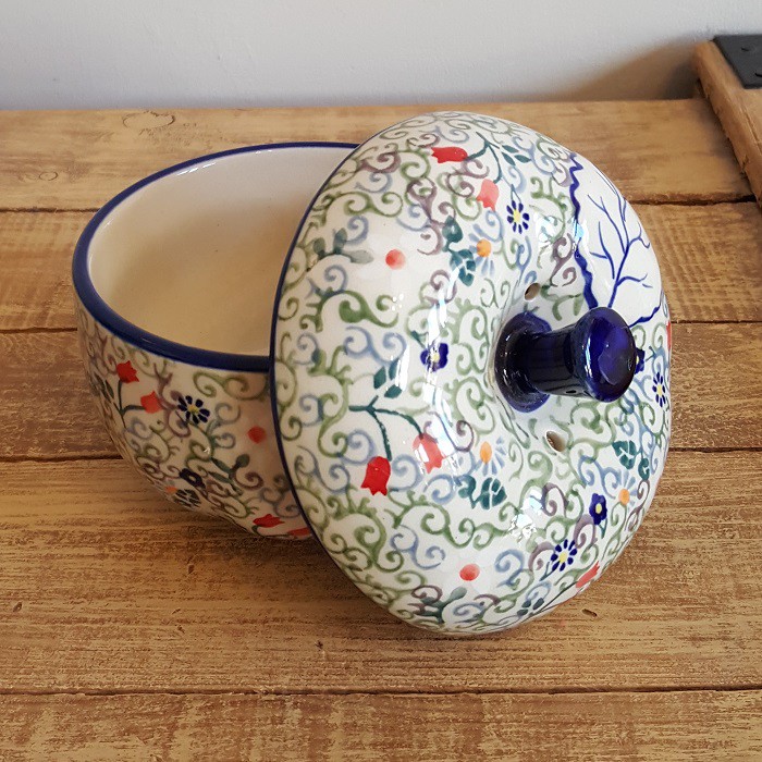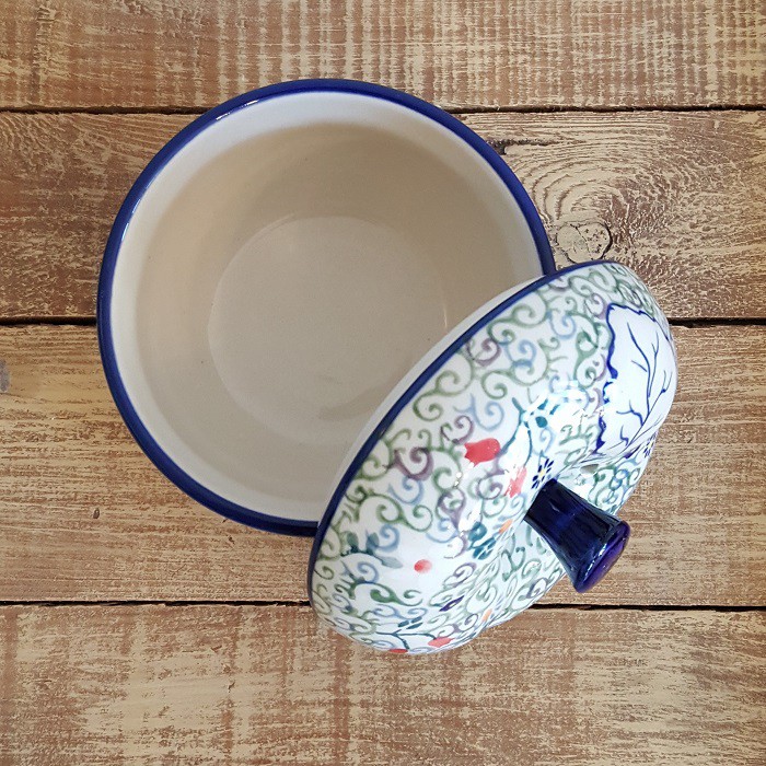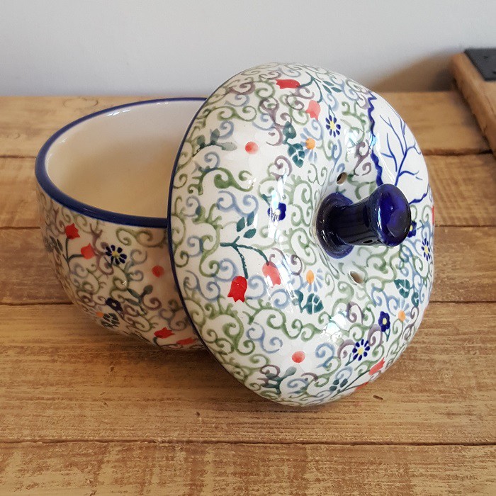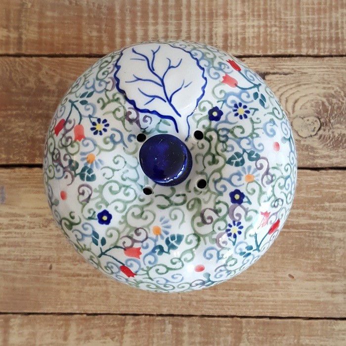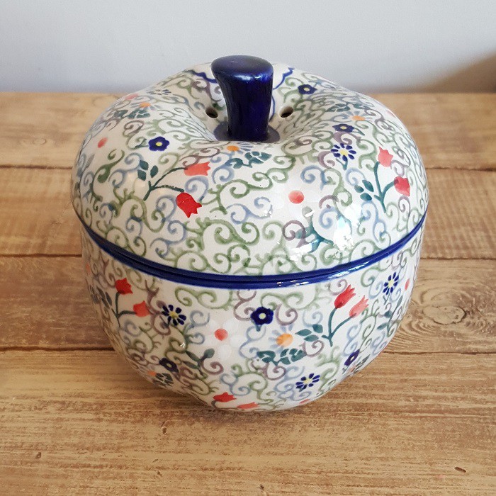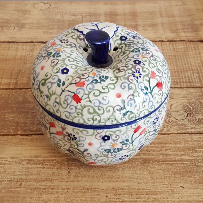 最もザクワディ社らしいデザインの1つであり、 世界的にも大変人気商品です。 内部には絵付けはありません。 りんごのふくらみに沿って、内側の側面も少し波打っています。 丈夫で熱に強く、電子レンジやオーブンもOKなのがポーランド陶器の魅力! 蓋に四箇所、蒸気を逃がす穴があいており、りんごを丸ごと蒸し焼きにすることができます。 りんごだけでなく、様々な蒸し物料理に活用できます! お菓子ジャーとして、テーブルにおいても素敵なインテリアに。