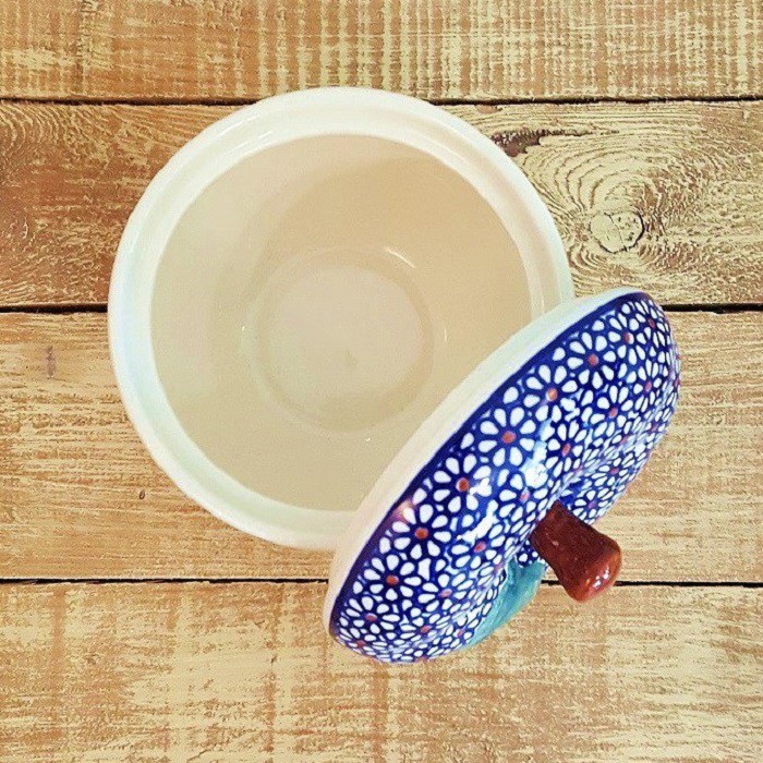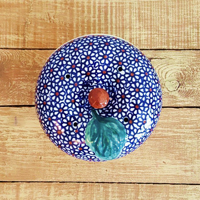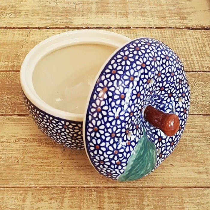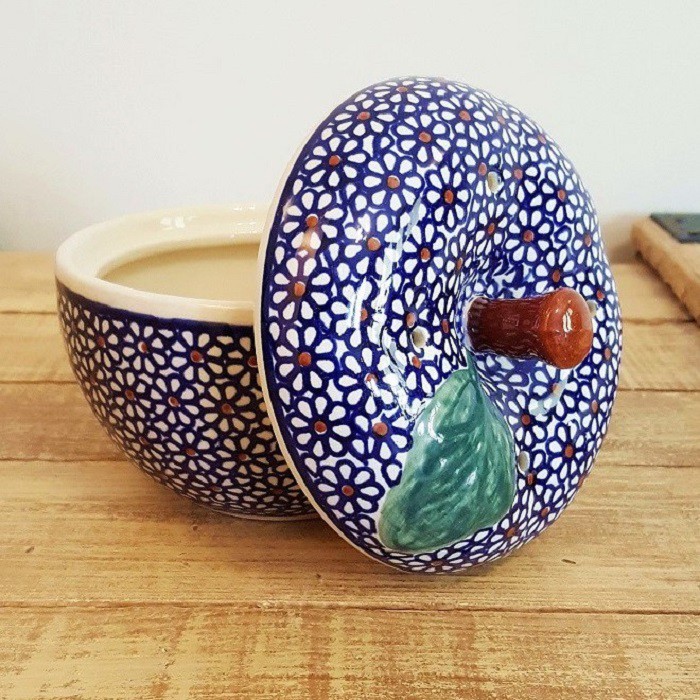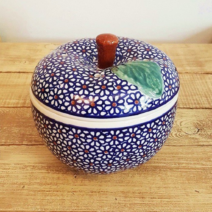丈夫で熱に強く、電子レンジやオーブンもOKなのがポーランド陶器の魅力! 蓋に四箇所、蒸気を逃がす穴があいており、りんごを丸ごと蒸し焼きにすることができます。りんごだけでなく、様々な蒸し物料理にも活用できます。! お菓子ジャーとして、テーブルにおいても素敵なインテリアに。