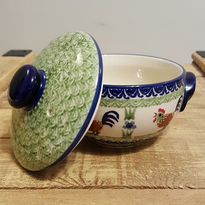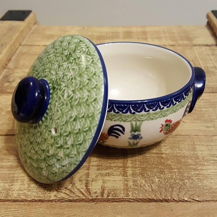 両脇に持ち手が付いた、一人用の土鍋くらいのサイズのボウルで、蓋が付属します。