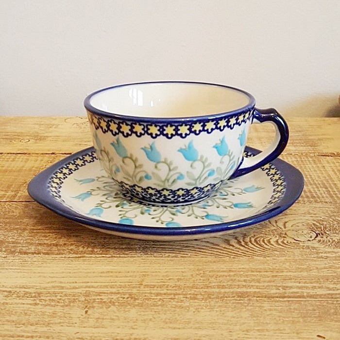 ポーランド陶器 Manufaktura カップ&ソーサー 飲み口が少し広がっているタイプのカップと平らなお皿です。