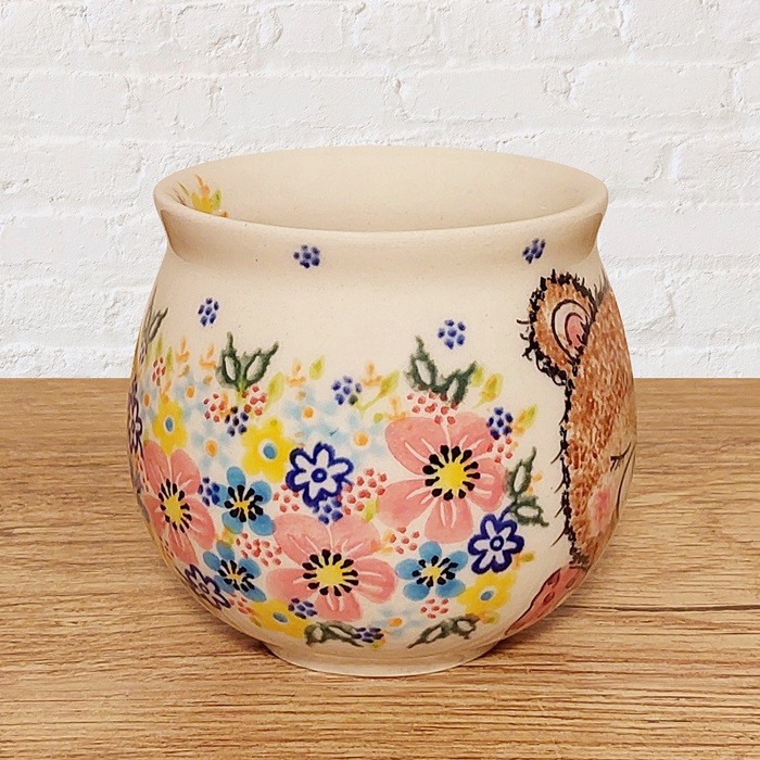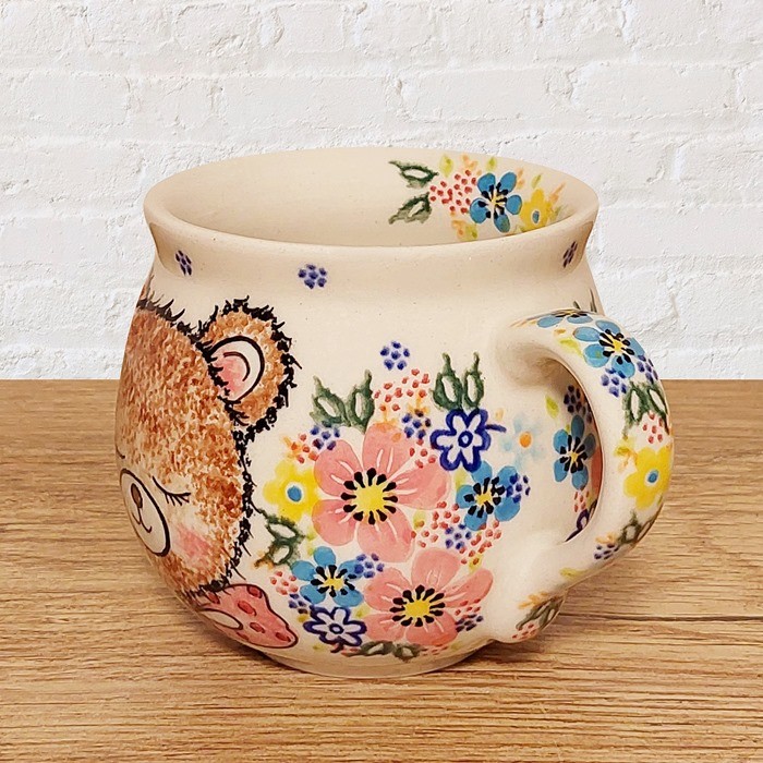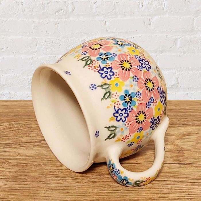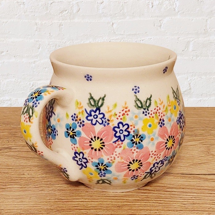 このマグカップは、ポーランド陶器ならではの温かみを感じさせる、ぽってりとした丸いフォルムが特徴です。