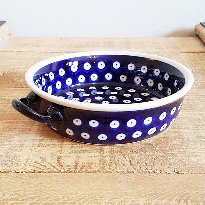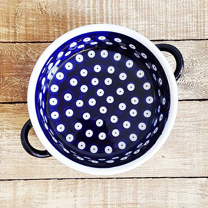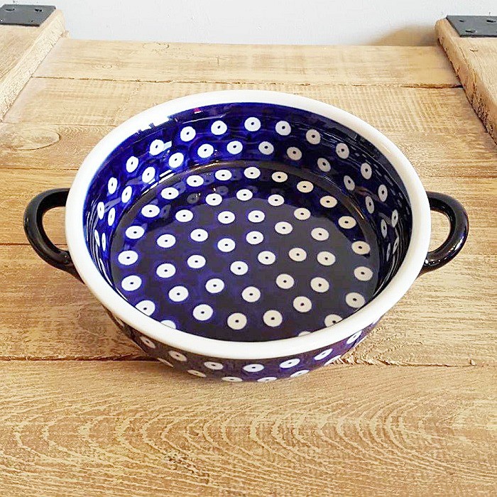 ふちに2つの持ち手がデザインされたとても可愛らしいオーブン対応のキャセロール。